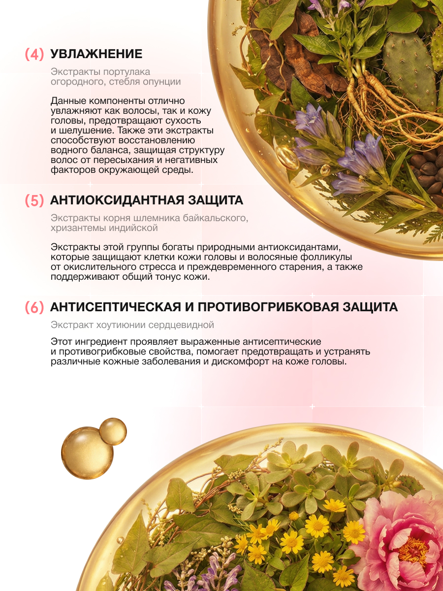 • Экстракты женьшеня, имбиря, горечавки и солодки помогают тонизировать кожу головы и поддерживать ощущение свежести.