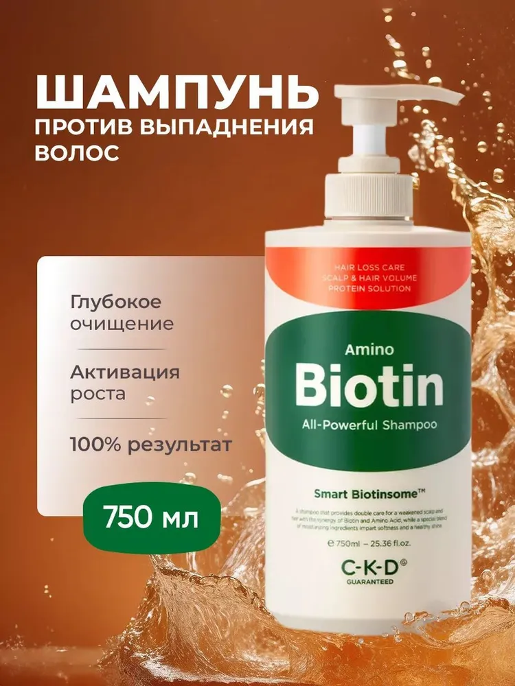 Шампунь для волос против выпадения с биотином CKD Amino Biotin All-Powerful Shampooоказывает выраженное укрепляющее действие, мягко отшелушивает кожу головы, хорошо промывает и очищает от всех загрязнений. Не пересушивает и не вызывает раздражения.